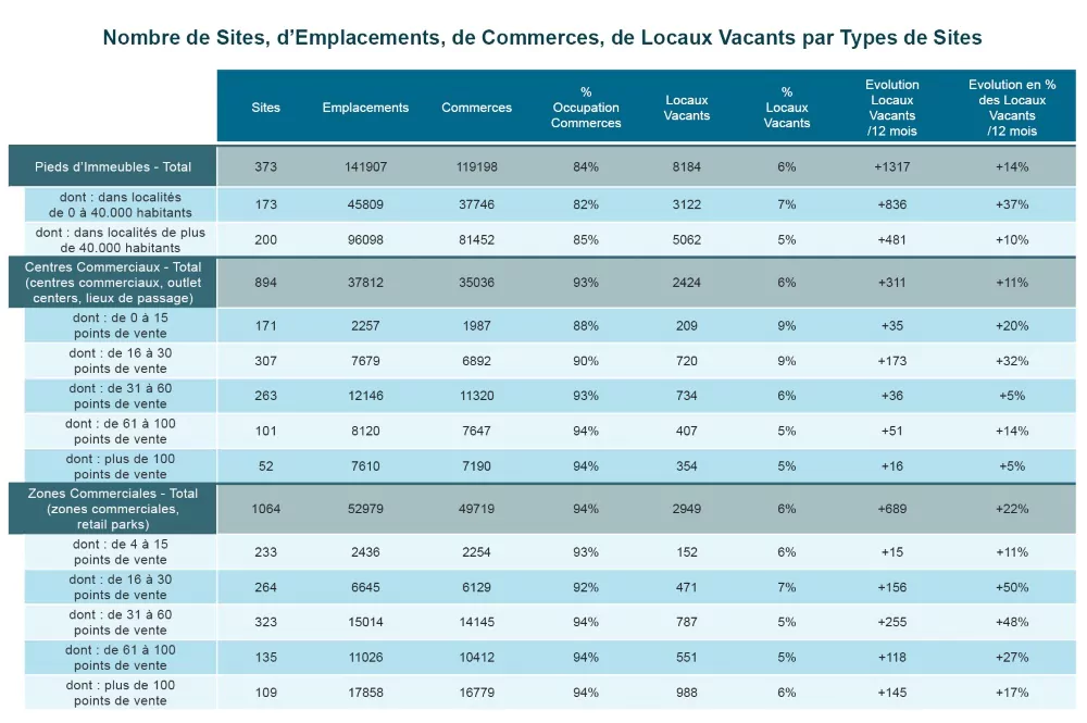 France : Nombre de Commerces, d’Enseignes Nationales et de Locaux Vacants par Types de Sites